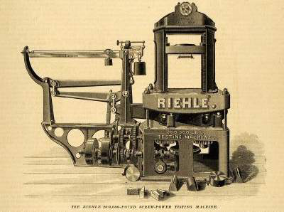 在中國,杠桿式拉伸試驗機被引進大概是在上世紀初,同濟大學建設初期,引進一臺同濟編號為:440001的杠桿式拉伸試驗機(圖二),目前,存放于同濟大學力學試驗中心。這臺試驗機上同時標有“RIEHLE BRCXPHILA16494”(圖三)的小字,通過檢索,發現這臺試驗機是由位于美國費城的理勒兄弟測試機械公司(Riehle Brothers Testing machines Company)生產。